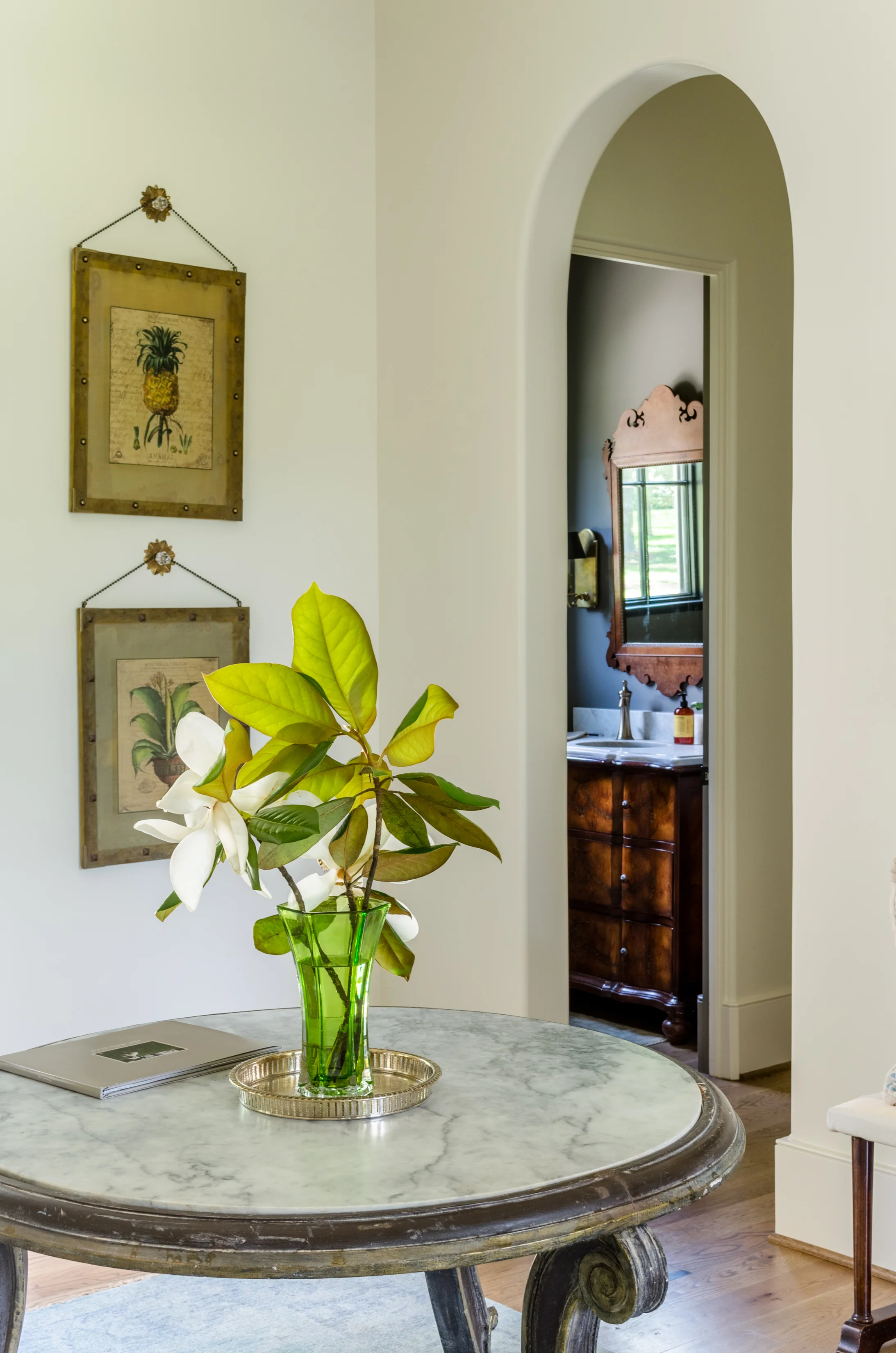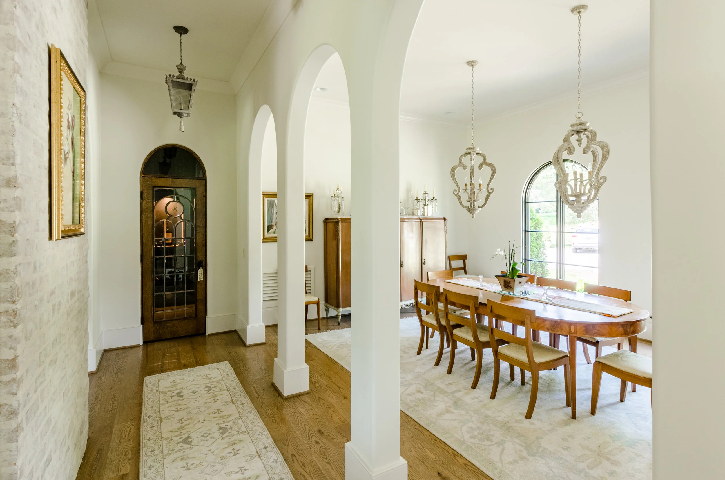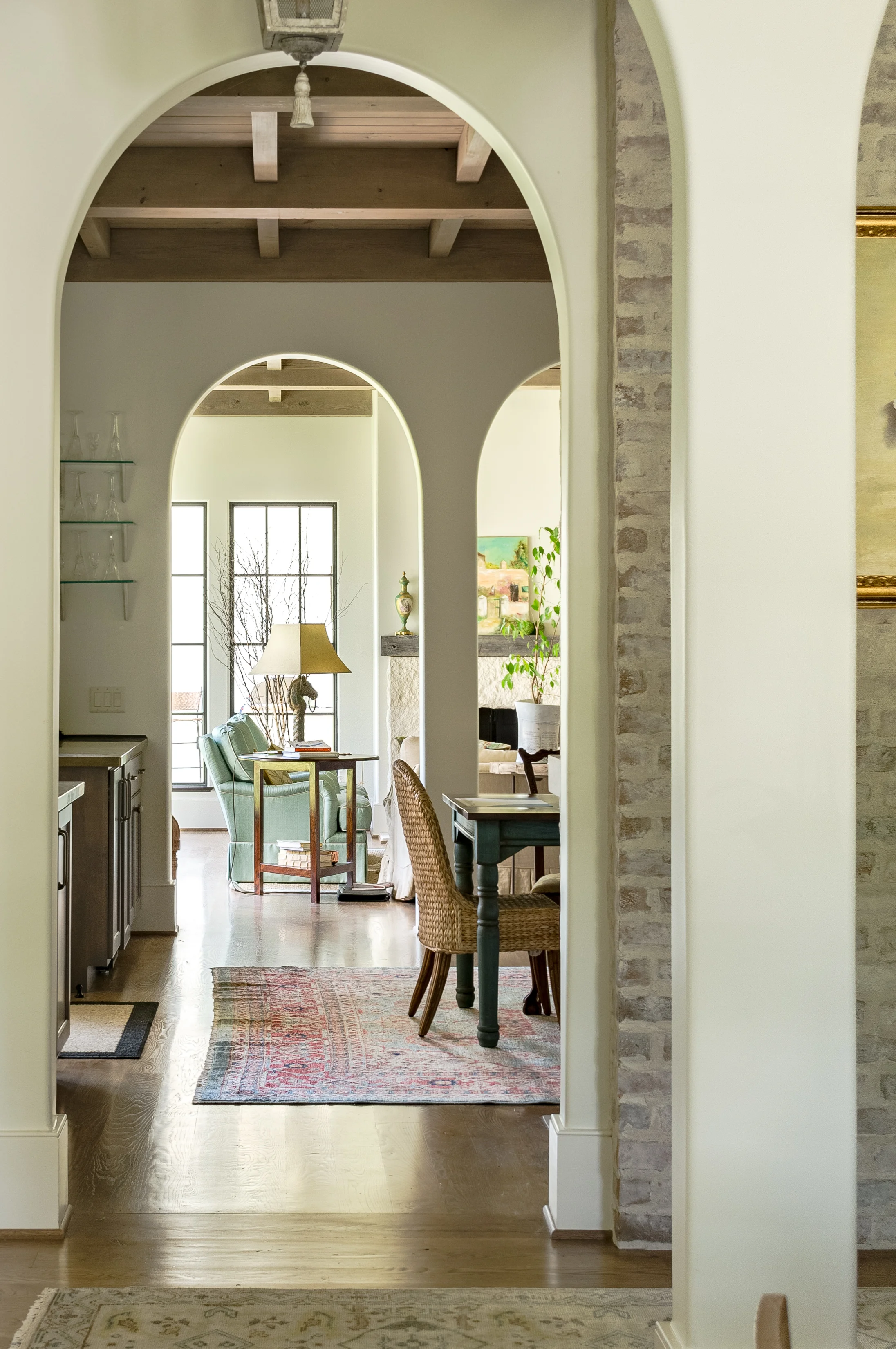 This residence in the Forest Hills area of Nashville Tennessee was inspired by Tuscan and other Mediterranean precedents filtered through the client's love of coastal houses- but then transformed to be appropriate to its site and context. The site is in an area of rolling hills, but relatively flat for the area, so the architecture takes clues from the horizontality of the property. The drive leads through a stand of pine trees that shield the house from the busy thoroughfare, and gracefully swings in front of a deeply recessed front entry arch. The front entry immediately connects to a covered terrace, the back lawn and the views beyond- and separates the private areas of the house, to the left, from the more public areas, to the right. Arcades divide spaces in order to keep them open and contemporary, yet defined as separate rooms and functions.