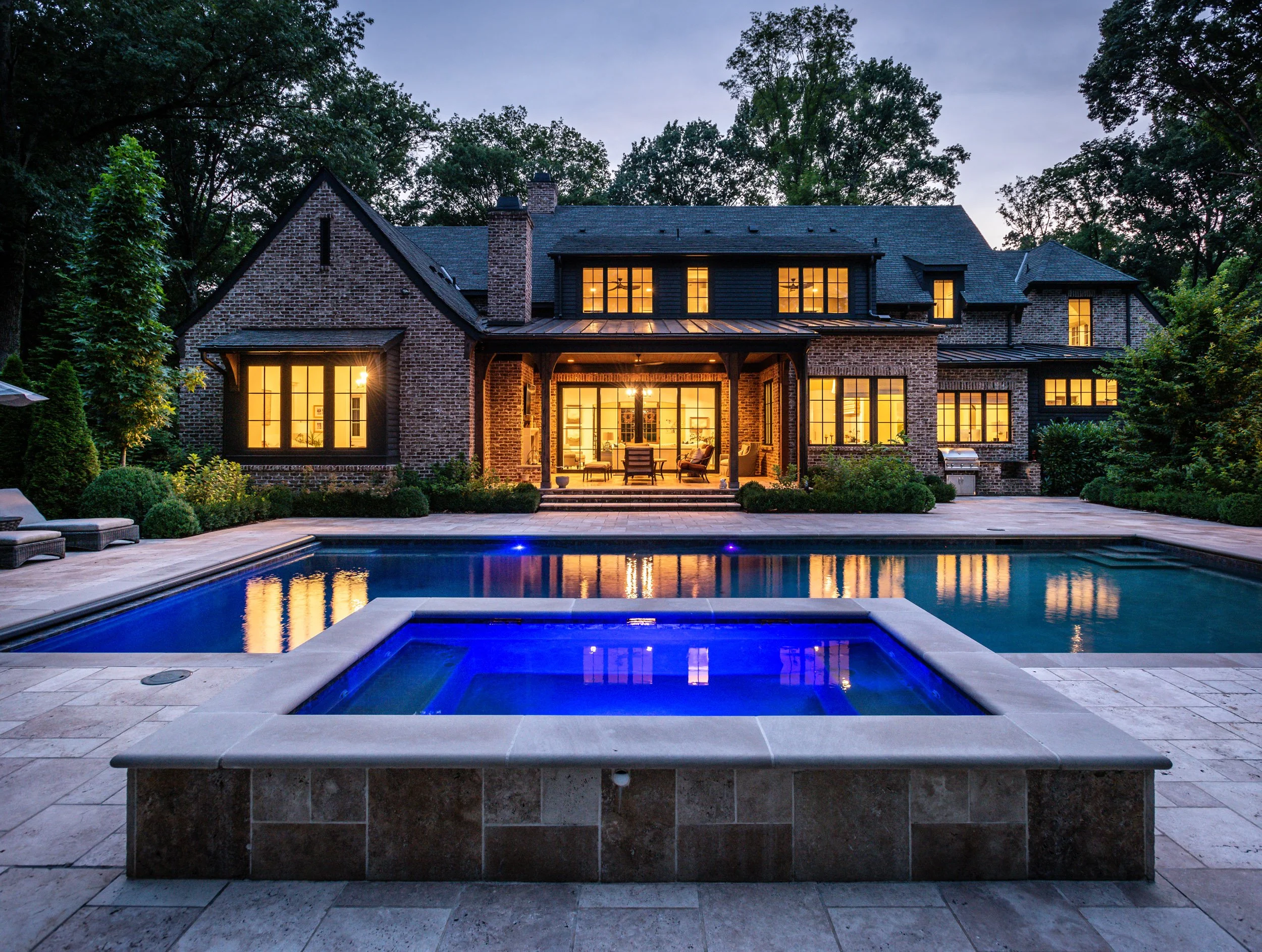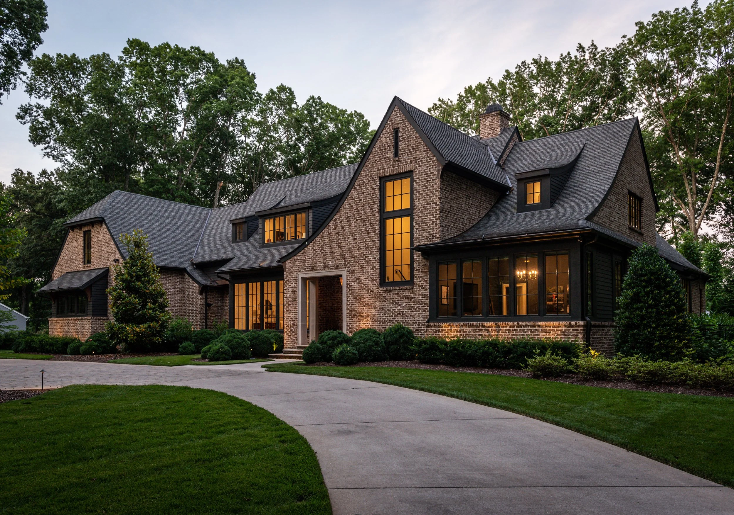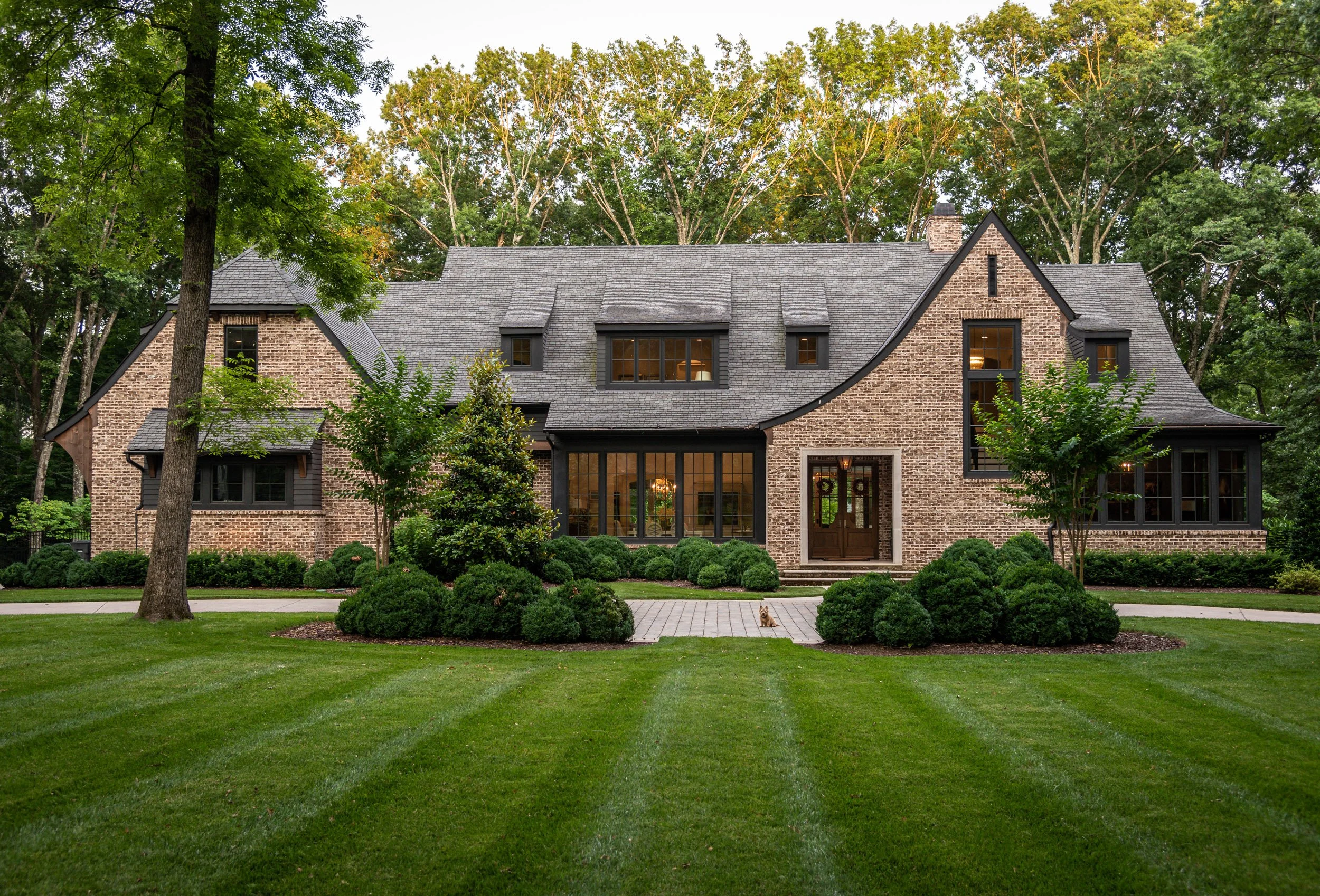 This home based loosely on English Arts and Crafts precedents, mainly homes executed by Baillie Scott and Edwin Lutyens, filtered through more contemporary Southern versions of Arts and Crafts influenced homes, sits on a large lot in the West Meade area of Nashville, Tennessee. The exterior consists of natural hand-made brick contrasted by dark painted siding and limestone details. Visitors are greeted with a welcoming swooped roof and limestone surround at the front porch and entry, and generous glazing at a front facing stairway. The dining room is immediately to the left and has a full wall of glass that views the expansive front yard. A spacious Living Room and Kitchen open beyond to a large covered porch accessed through large glass sliding doors. Views open to the terraces, swimming pool, pool house, and lush landscaping that provide a private courtyard feel. Construction and Interior Design was by Castle Homes, and Landscape Design was by Outdoor Ink LLC. Photography by Reed Brown.