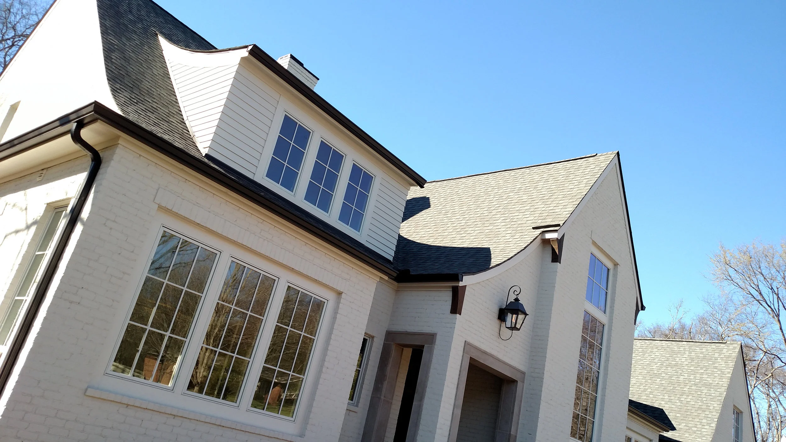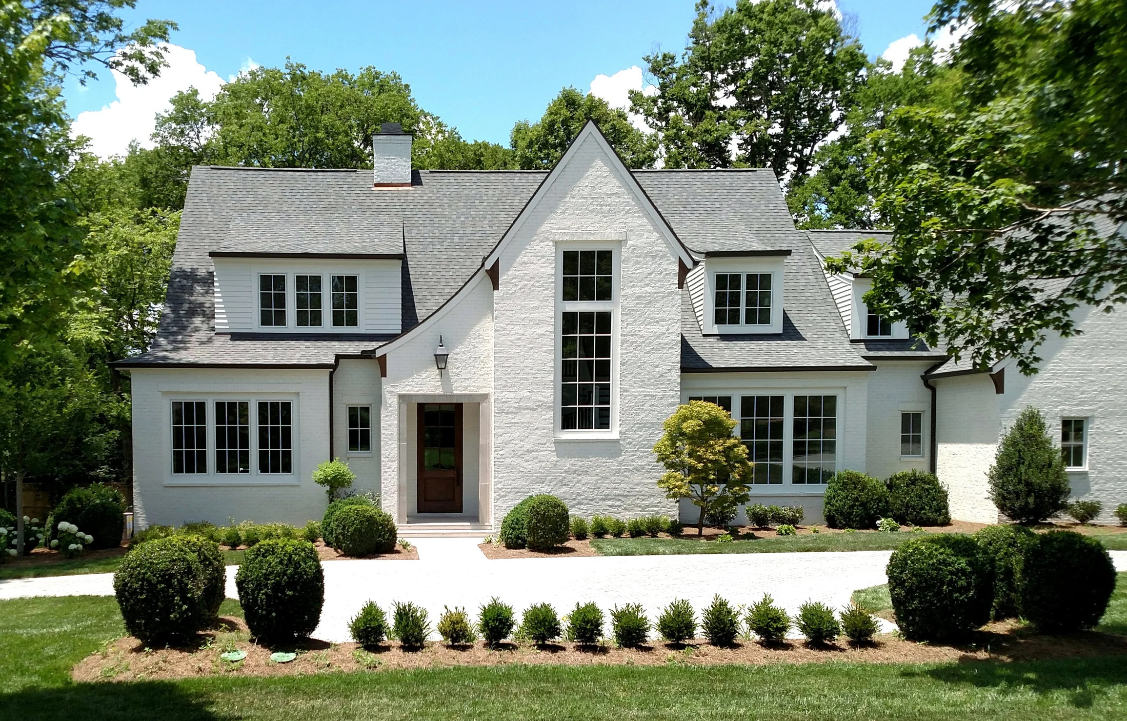 This lovely home in the Forest Hills area of Nashville, Tennessee continues our exploration of English Arts and Crafts precedents, by combining painted brick gables with sided swooping dormers- and the window groupings that express the function of the spaces on the interiors. The interior is marked by an open, contemporary floor plan arrangement conducive to modern living. The landscape design by Michael Baldwin of Outdoor Ink compliments the composition with a sinuous, paver driveway and a mixture of formal and informal planting arrangements.